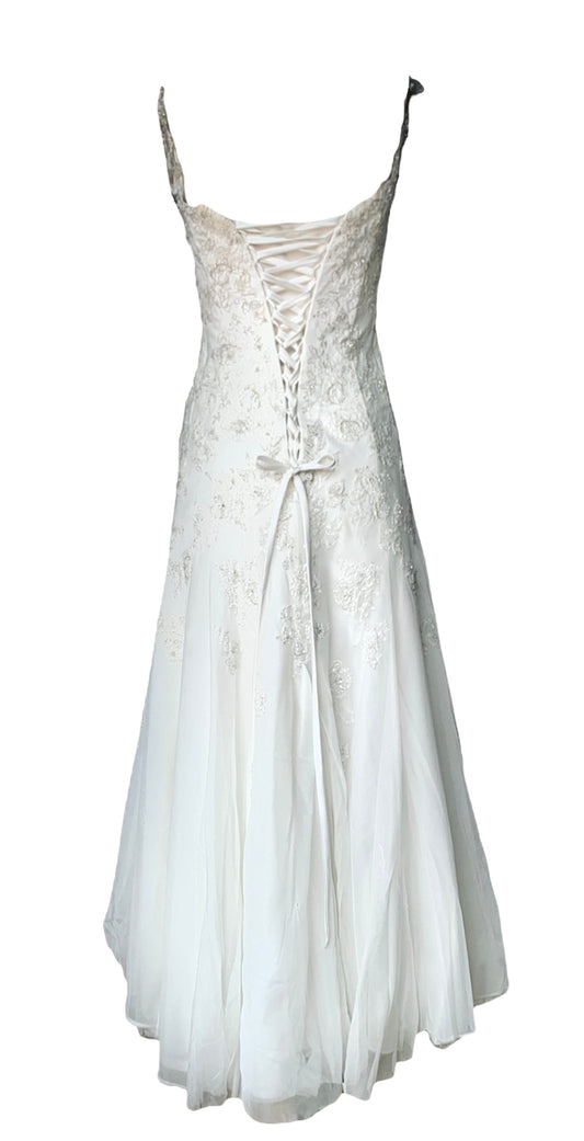 Ivory mesh halter dress with asymetrical fish-tail skirt & satin under-bust band