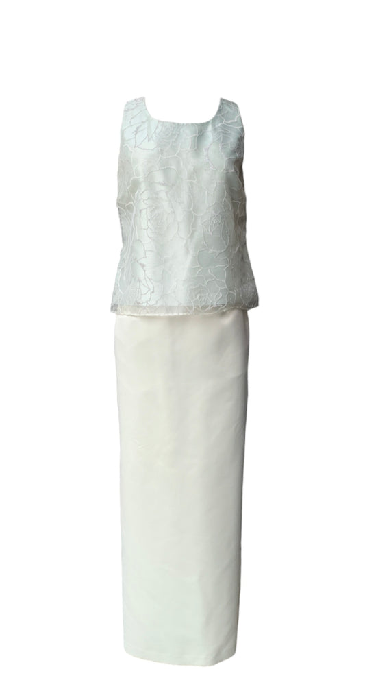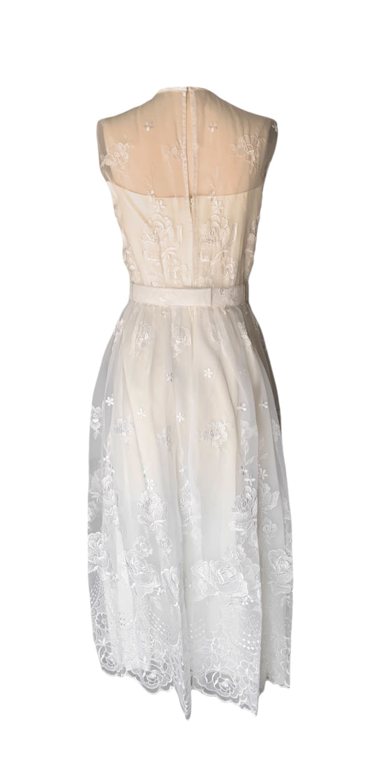 Ivory Floral Embroidered Organza Sleeveless Tea-length Column Dress